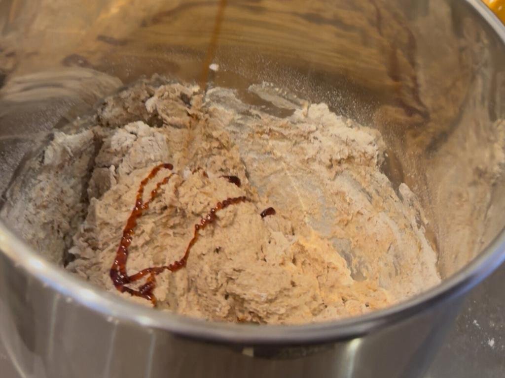 - 1Voeg aan een mengkom eerst water en melk toe en daarna actieve zuurdesemstarter.