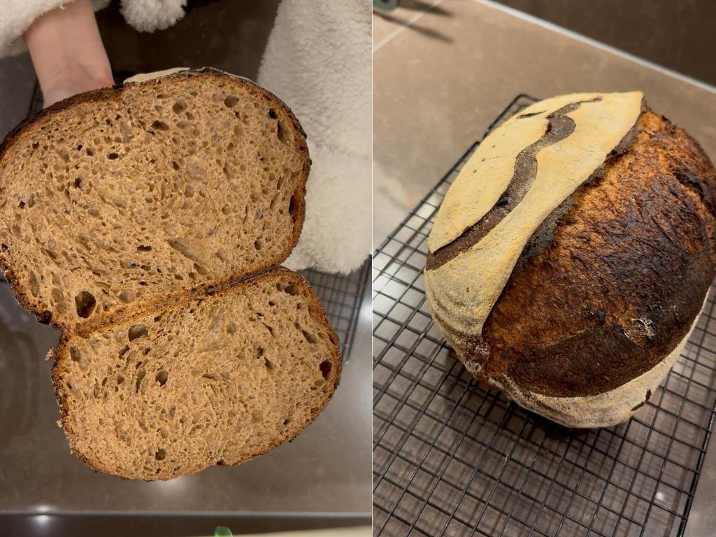 - Extra leuk: dit brood komt donkerder uit de oven dan een normaal zuurdesembrood. Dat komt door de stroop in het deeg: de suikers karamelliseren tijdens het bakken. Helemaal normaal en juist prachtig!